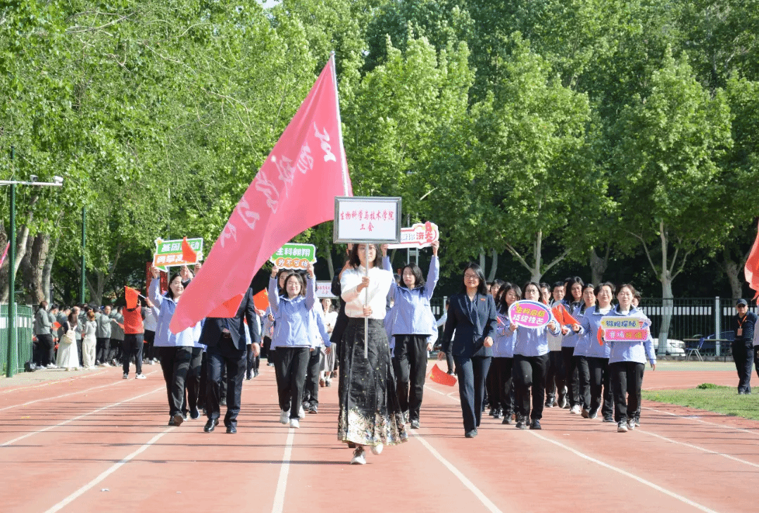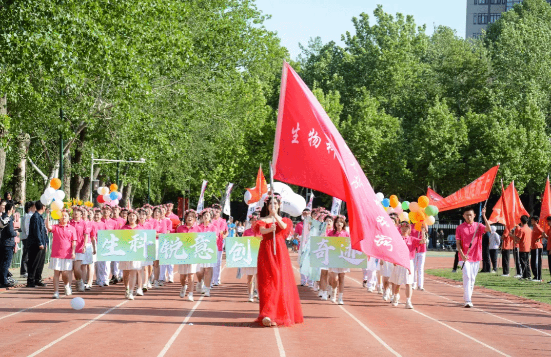 的学生和教职工方阵英姿飒爽,他们步伐整齐,每一步都似那有力的鼓点,敲响运动会的序曲。平日里,教师是带领学生在知识的海洋中遨游的引路人,而此刻,他们脱下“知识华裳”,是赛场上的运动健将。同样地,生科学子们目光坚毅,炯炯有神中燃烧着对胜利的渴望。他们斗志昂扬,誓要在竞技场上绽放属于青春的光芒。
