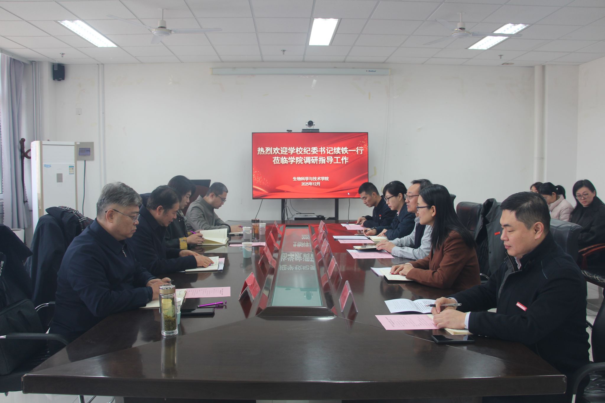 续铁书记对学院在党建与业务深度融合、学科建设、人才培养等方面取得的成绩给予充分肯定。在集体廉政谈话环节,续铁结合高校工作实际,对班子成员提出以下三点要求:一要提高政治站位,扛牢全面从严治党责任担当。深入学习贯彻党的二十届四中全会精神,抓实教师党员教育管理和师德师风建设,严格落实“一票否决”制,对失范行为“零容忍”,确保队伍纯洁可靠;二要强化理论学习,巩固拓展深入贯彻中央八项规定精神学习教育成果。领导班子成员要带头学、深入学、系统学,坚持不懈用习近平新时代中国特色社会主义思想凝心铸魂;三要强化作风建设,持续营造风清气正、干事创业的良好氛围。聚焦立德树人的根本任务和学校学院的发展目标,进一步展现新气象,实现新作为。在学科建设上追求卓越,在人才培养上精益求精,在科研创新上勇攀高峰,在社会服务上再建新功,为学校高水平大学建设做出贡献。