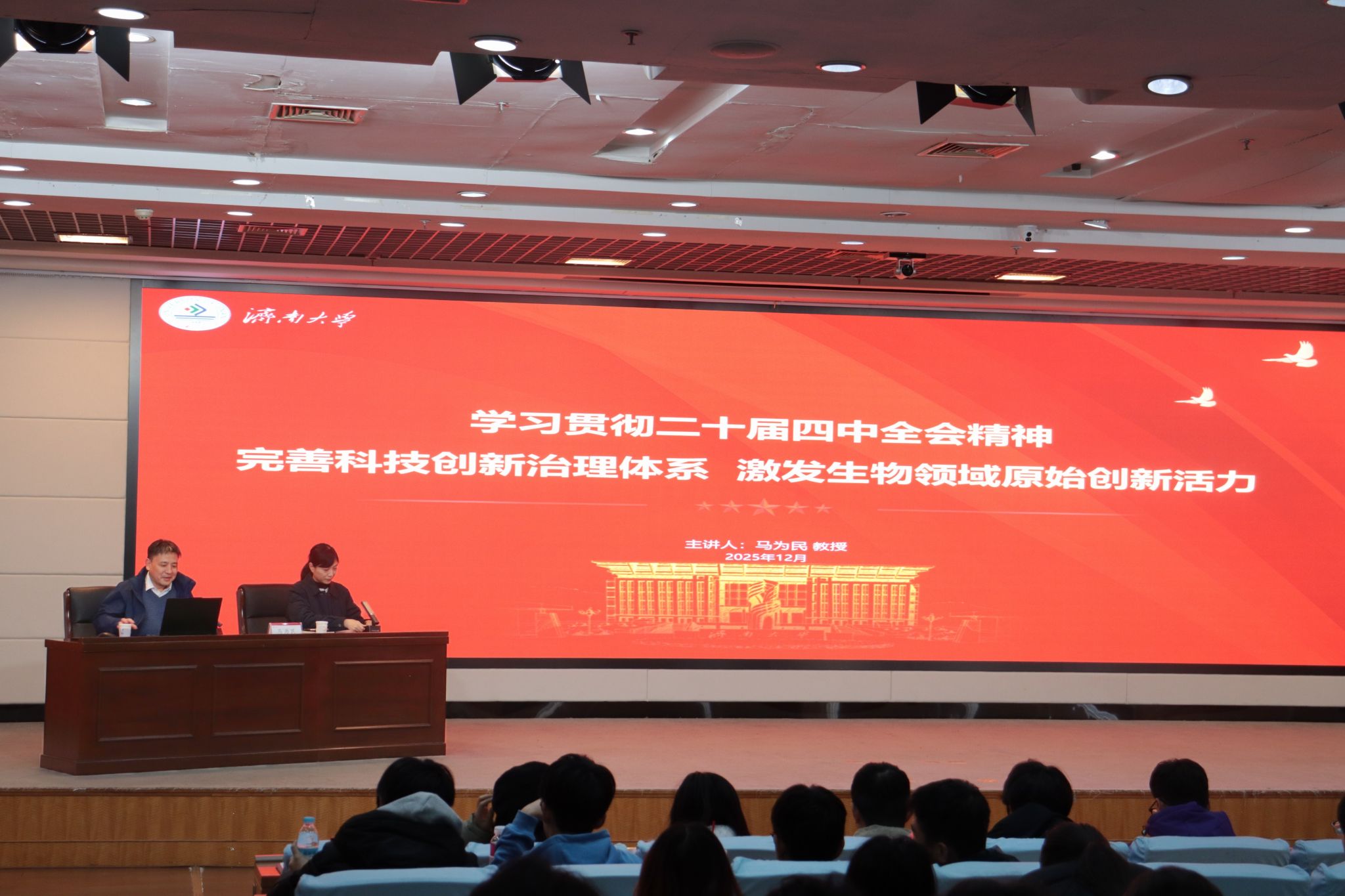 在第一学术报告厅举办“泉城大讲堂”主题报告会。本次报告会特邀中国藻类学会常务理事、全国光合作用专业委员会委员、上海市一碳生物技术专委会副主任马为民教授主讲。学院师生党员代表、“青马工程”学员、入党积极分子以及2025级全体学生参加。报告会由学院党委副书记、副院长杜艳主持。