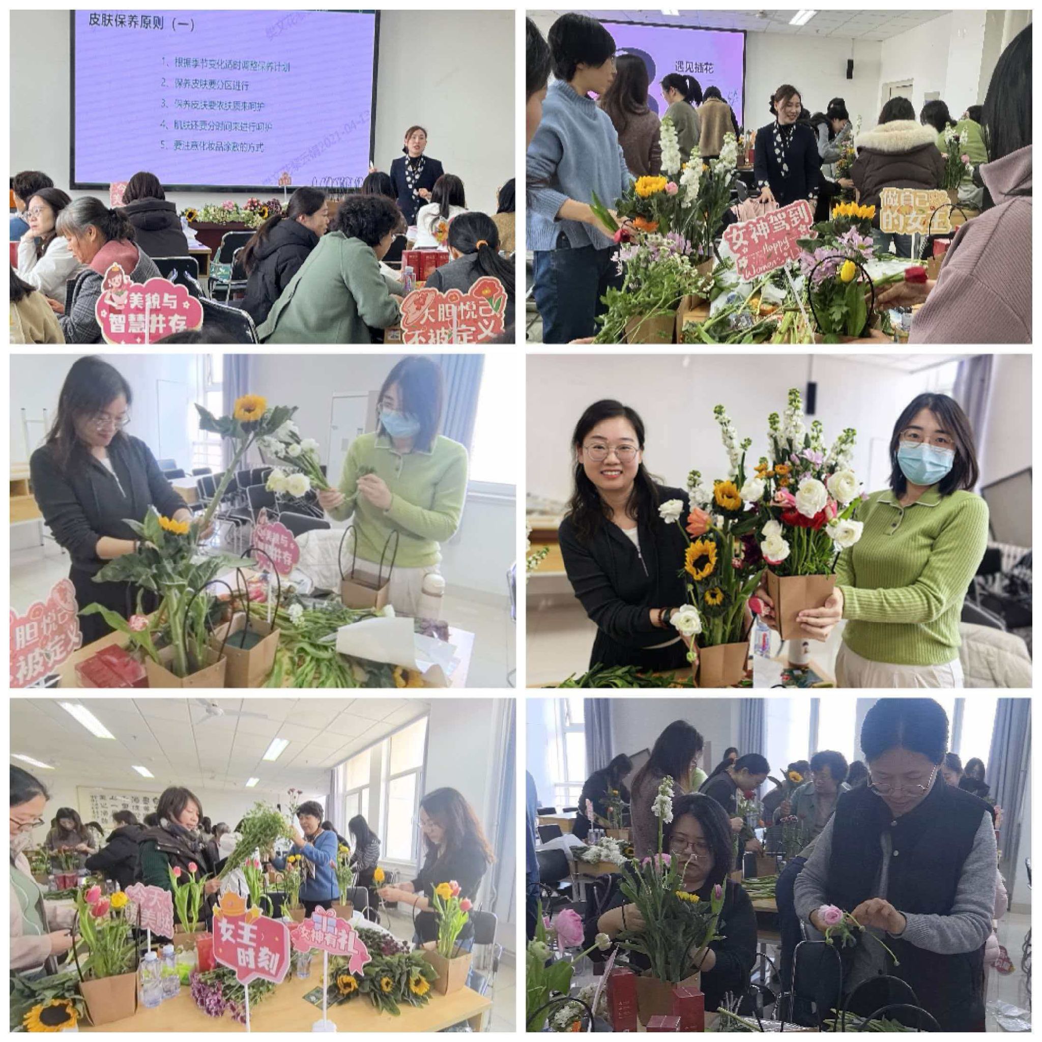 本次活动以“智美同行·芳华共绽”为主题,紧扣女教职工对健康与美的双重追求,内容兼具科学性与趣味性。健康美学分享环节直面日常护肤困惑,将专业知识转化为实用技巧,解锁科学护肤“新密码”,让健康之美扎根生活细节;随后的东方花道沉浸体验,则将春日生机与个人巧思融入指尖创作——修剪枝叶、构思造型间,疲惫悄然消散,专注与美感共生,大家在花叶舒展中感受自然之力,于匠心创作里涵养从容心境。