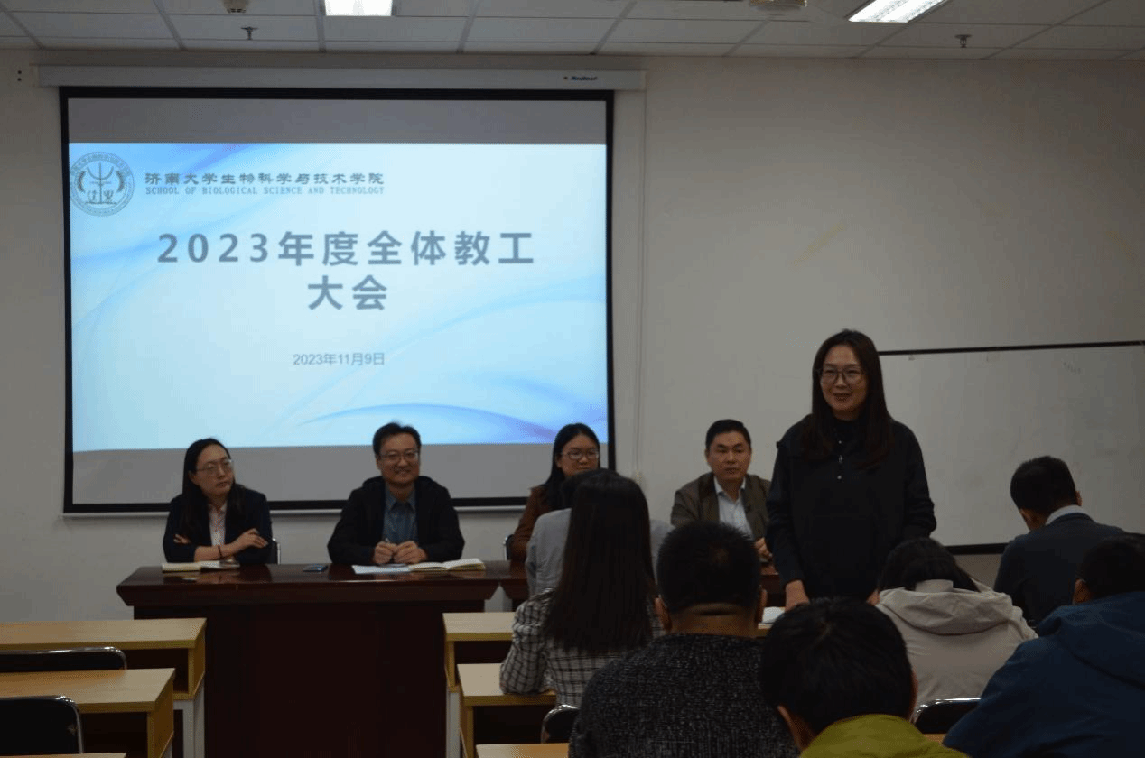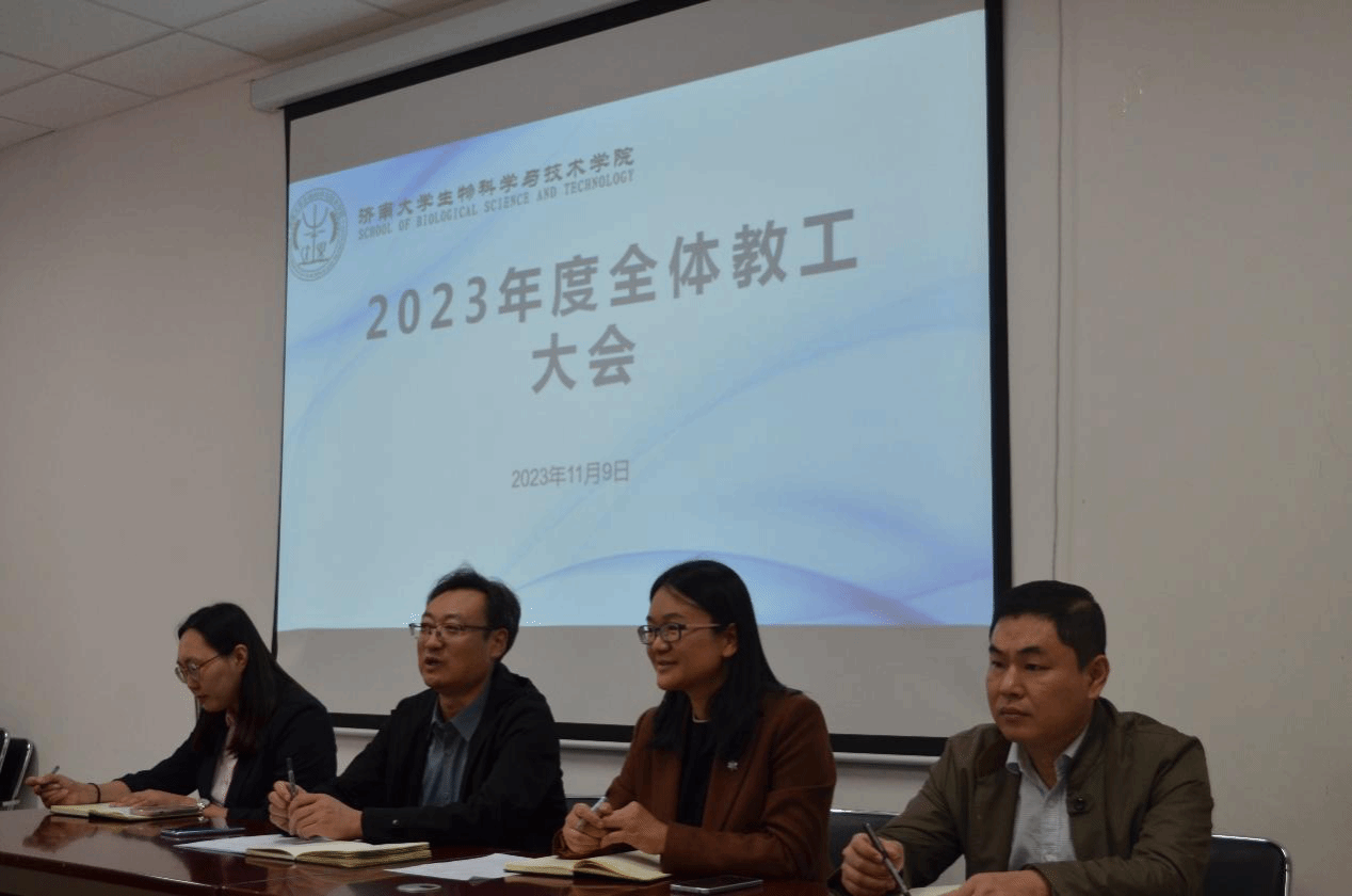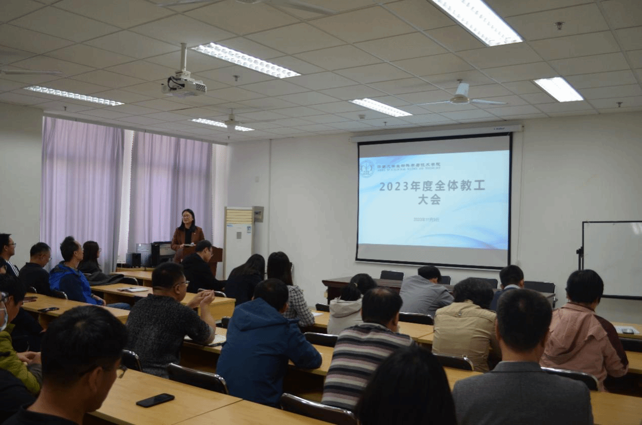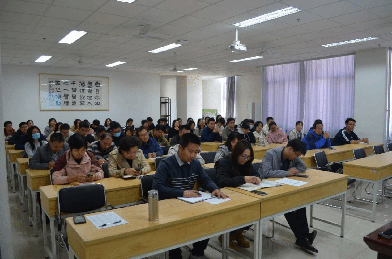 在特教楼B1010教室召开全院教职工大会,学院党委书记史国普,院长秦晓春,党委副书记、副院长武芳,副院长李强以及全院教职工参加。本次会议由史国普主持。
