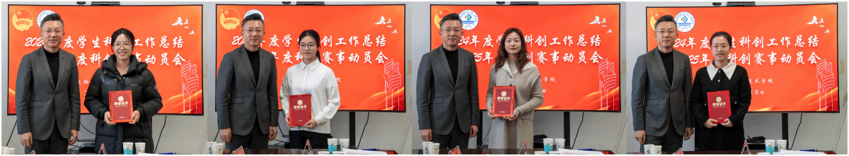 副校长王霞和校团委书记胡春毅分别为2024年度科创赛事获奖指导教师和团队负责人代表颁发证书。